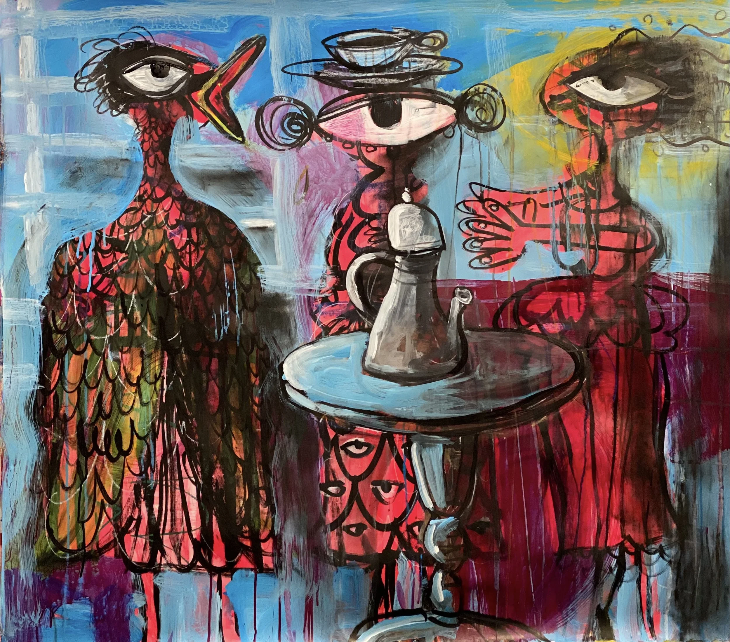 New York, NY, September 28, 2023 – La MaMa Galleria is honored to present Into The Wild: To Crash is Divine. Into The Wild presents the pathbreaking, allegorical works of protean painter and ardent colorist Deborah Buck. It is a focused solo exhibition showcasing nearly two dozen recent works. An exploration into contemporary concerns, the works are incarnations of Buck’s inquiries on social attitudes, culture and blasphemy, and emotional freedom at once personal and universal. Elegant and polemical, the art included in Into The Wild attests to Deborah Buck’s arrival at a distinctive narrative filled with fantastically Fauvistic personas and cautionary tales. Colliding secular with the sacred, the exhibition hints at essential codes that unravel the icons and slogans of our time; protest and provoke. Into The Wild invites a raw and fresh conversation with playful aesthetics, humor, and imprudence. It is a baroque fantasy fortress that upholds active pursuit and the joy of queueing.
